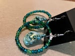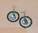 These Green Hoop earrings feature a vibrant combination of glass beads and a unique green natural shell centerpiece. The shells, each with a distinct shape, hang gracefully in the center of the hoop, adding a natural, organic touch to the design. The contrasting textures of the smooth glass beads and the irregular shapes of the shells create a stylish and eye-catching accessory.
